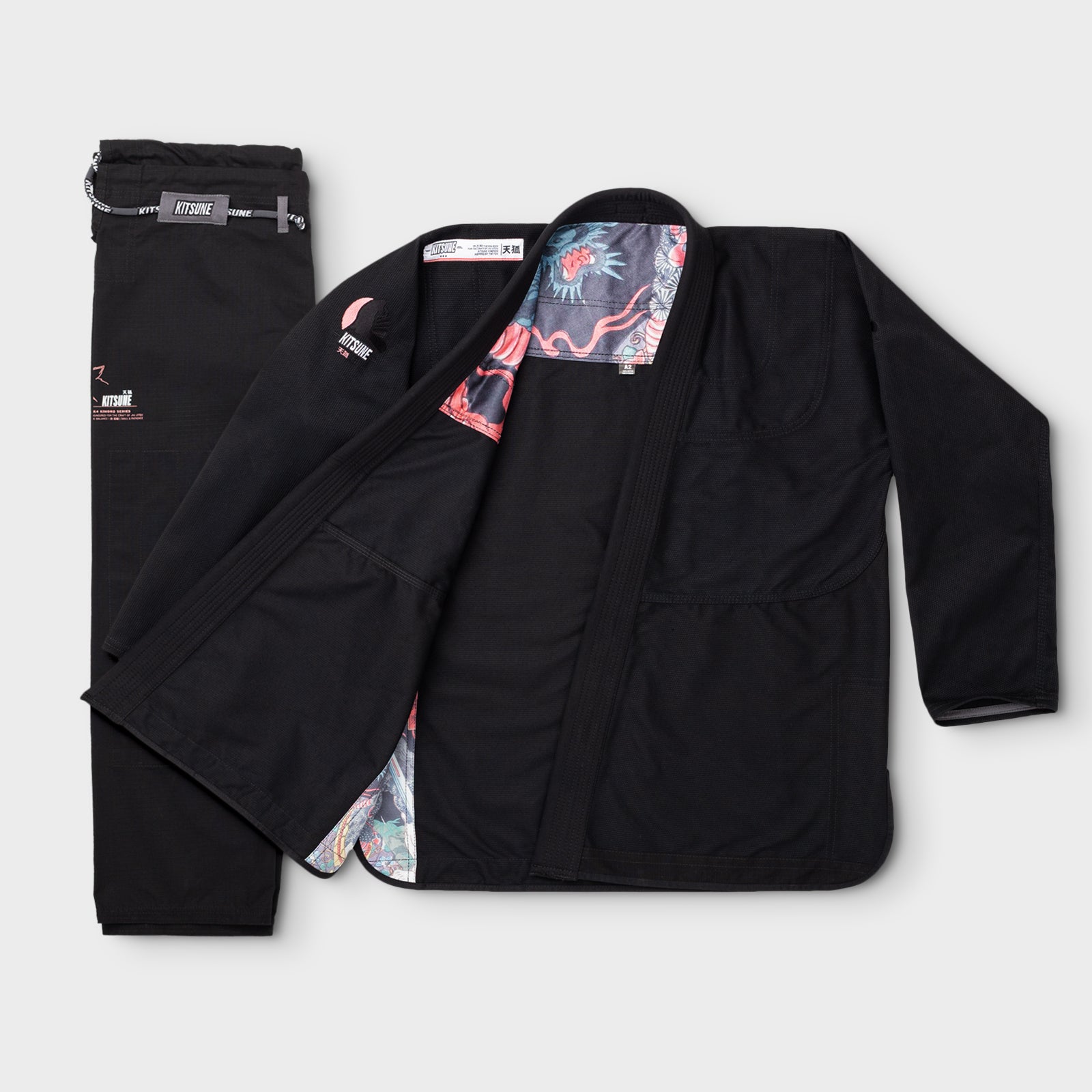 Inspired by centuries old Japanese woodblock artwork, our 2nd wave of Gis, the "Heroes" Series, is available in white and black. Featuring a sublimated rendition of classic ukiyo-e woodblock artwork. . The soft sublimated panels consist of a breathable poly blend mesh so it's not stiff or uncomfortable even once soaked with sweat. We use a thicker collar insert (EVA foam) so it's no walk in the park for your opponent to grab a mean collar grip or worm grip.