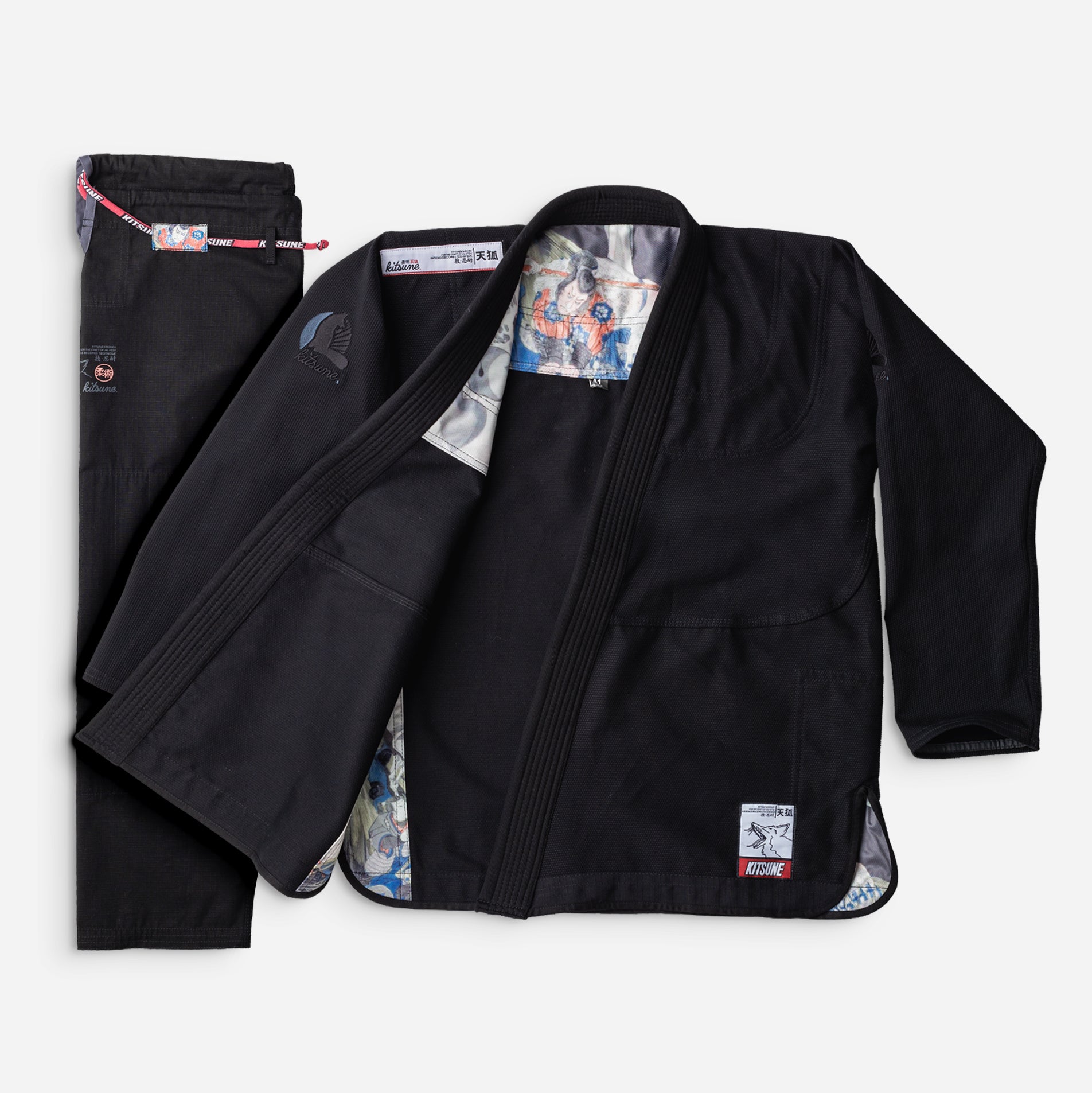 Inspired by centuries old Ukiyo-e woodblock artwork, the this gi features a sublimated rendition of Kuniyoshi's iconic "Spectre" woodblock. The soft sublimated panels consist of a breathable poly blend mesh so it's not stiff or uncomfortable even once soaked with sweat. We use a thicker collar insert (EVA foam) so it's no walk in the park for your opponent to grab a mean collar grip or worm grip. Thin rounded piping runs uninterrupted along the jacket hem right up the connected round vent cut.